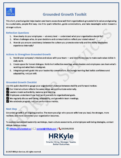 The Grounded Growth Toolkit from HRKyle Services gives leaders and HR professionals a quick, practical framework to assess and strengthen both sides of that balance — the stability that builds trust and the adaptability that fuels success.